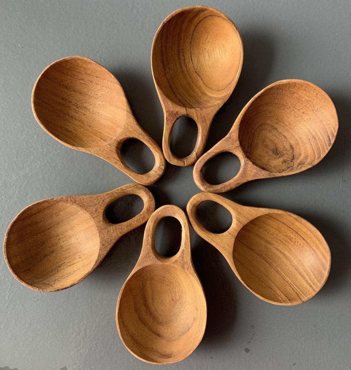 The cutest small scoops, 8cm long and 4.5cm wide, made from teak.