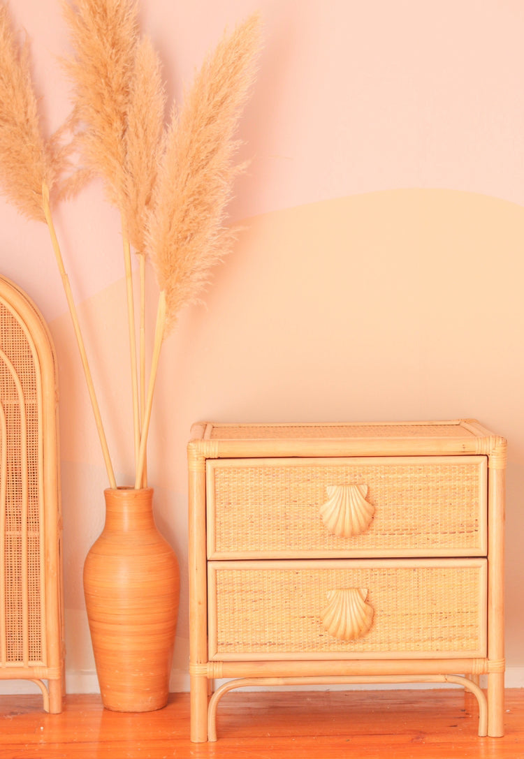 we’ve been really excited to release this stunning Oceana bedside table designed in-house by us at juni moon! it’s been hand crafted using a combination of hardwood and rattan and has been made in a large size to suit children’s and grown ups spaces alike! It features two large drawers with wooden hand carved shell drawer pulls