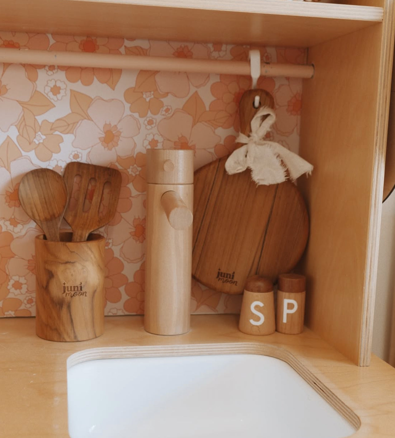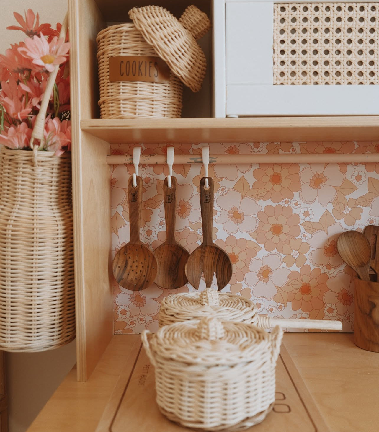 The set includes five unique spoons, each carefully carved to perfection plus a wooden storage pot. Whether hanging from hooks in a play kitchen or neatly stored in our matching storage pot, these spoons add a rustic charm to any play space while encouraging hands-on fun and learning!