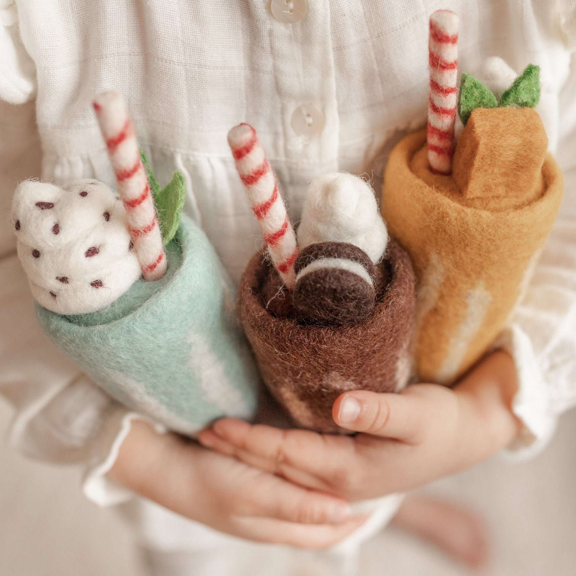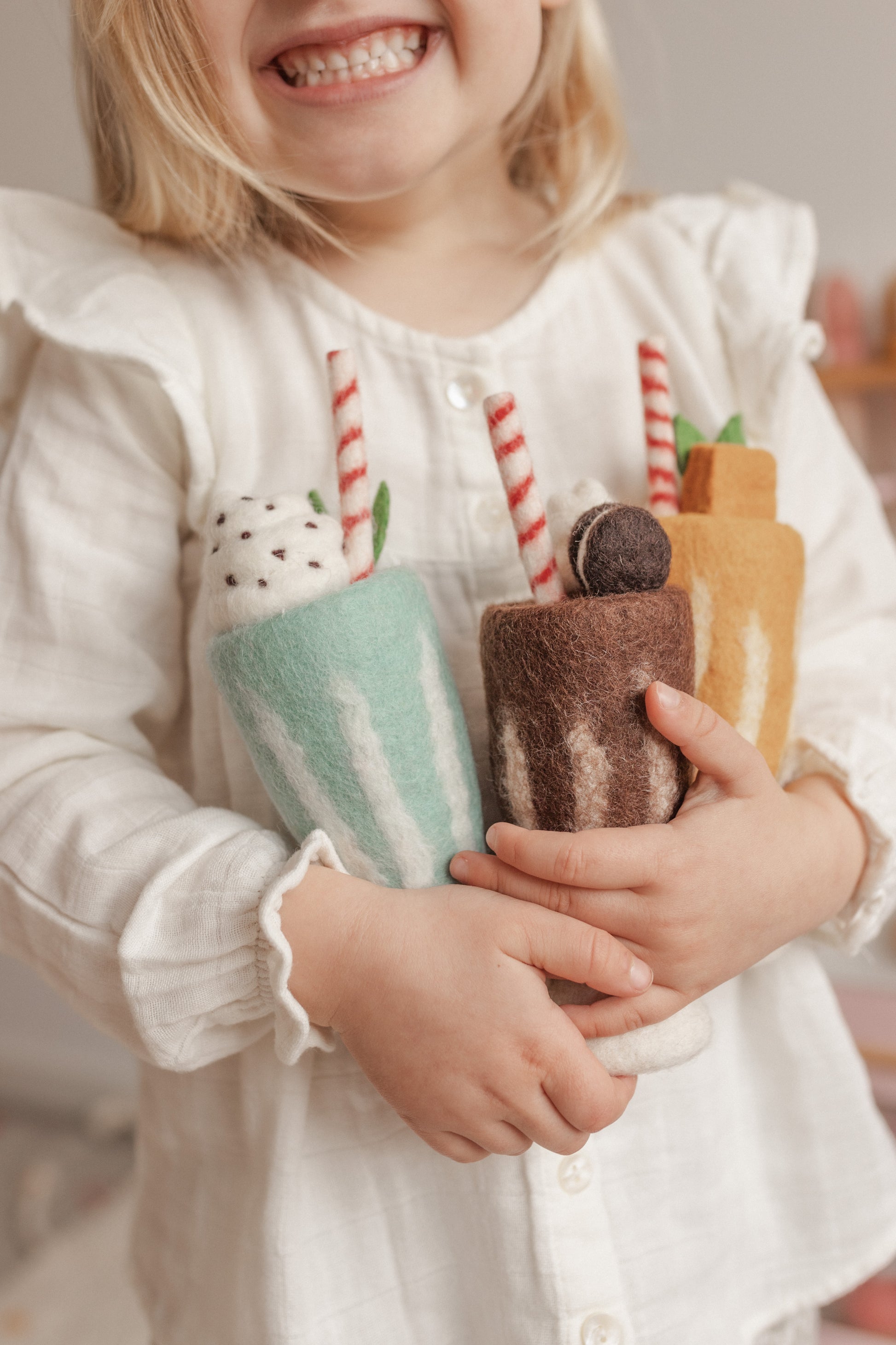 Our Milkshakes are hand drawn and designed in Melbourne by Juni Moon©️ and carefully hand made by our team of artisans, using the highest quality New Zealand wool and using Azo-free dyes that comply with all international safety standards and deemed safe for children.